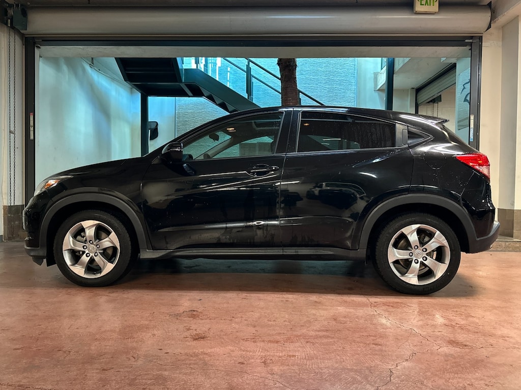 Black 2016 Honda HR-V EX FWD CVT 1.8L I4 SOHC 16V i-VTEC 4-Wheel Disc Brakes, 5.436 Axle Ratio, 6 Speakers, ABS brakes, Air Conditioning, Alloy wheels, AM/FM radio, AM/FM/CD Audio System (180 Watts), Automatic temperature control, Brake assist, Bumpers: body-color, CD player, Cloth Seat Trim, Driver door bin, Driver vanity mirror, Dual front impact airbags, Dual front side impact airbags, Electronic Stability Control, Exterior Parking Camera Rear, Front Bucket Seats, Front Center Armrest, Front fog lights, Front reading lights, Front wheel independent suspension, Fully automatic headlights, Heated door mirrors, Heated Front Bucket Seats, Heated front seats, Illuminated entry, Low tire pressure warning, Occupant sensing airbag, Outside temperature display, Overhead airbag, Panic alarm, Passenger door bin, Passenger vanity mirror, Power door mirrors, Power moonroof, Power steering, Power windows, Radio data system, Rear anti-roll bar, Rear window defroster, Rear window wiper, Remote keyless entry, Security system, Speed control, Split folding rear seat, Spoiler, Steering wheel mounted audio controls, Tachometer, Telescoping steering wheel, Tilt steering wheel, Traction control, Trip computer, Turn signal indicator mirrors, Variably intermittent wipers.